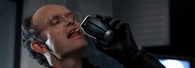 But the pleading seems to fall upon deaf ears as Robocop wraps his immensely powerful hand around Clarence's throat, choking the life out of him. As Clarence's eyes bulge and his oxygen supply is cut off, mouthing the words "cop!", Robocop is compelled to release him, his directives insisting he do so as much as his supreme sense of duty. With an emotion almost that of disappointment, Robocop grudgingly acknowledges: