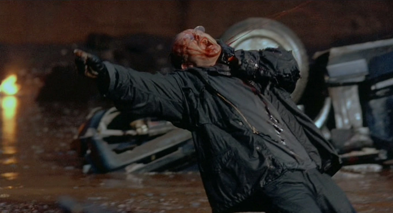 But Leon's calculations are masterfully accurate and, pulling the appropriate lever, sends tons of girders, slabs and chunks of metal raining down, piledriving Robocop into the water. The pair cheer, but, as they shout and whoop to each other, Lewis squeezes off a shot from Clarence's Cobra, obliterating the crane control room. Shocked at his last henchman's sudden death, Clarence directs his rage at Robocop, taking a length of jagged metal and leaping over to him, battering the cyborg, then plunging the bar through Robocop's breastplate, causing obvious pain. Leaning in for the coup de grace, he makes the mistake of getting too close to the machine taunting "Sayornara Robocop!" and the cyborg lunges for him, stabbing him through the neck with his data spike. The wound severes a major artery, causing powerful spurts of blood to come shooting forth in time with Clarence's elevated heartbeat, which reduce in intensity as Clarence staggers, then falls, before expiring in the rust filled waters leading to the defeat and dissolution of his gang and his body is taken away by medical team led by Warren Reed and Mayor Gibson.